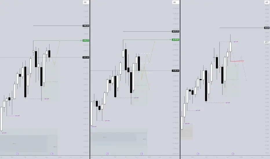 YM - plan zakończony i nie otrzymaliśmy dobrego zamknięcia nad szczytem co psuje nam układ, bo nie mamy dobrego ruchu manipulacyjnego. Skupiam się więcej na ES/NQ w tym tygodniu bo mamy zapas ruchu do BSL. Żeby SMT do S zostało aktywowane, wszystkie indeksy musiałyby się zamknąć pod poprzednią świecą, dlatego na YM pokazuję o co chodzi, ale wykluczam go z analizy dalszej na 1W teraz i nie szukam tam szczęścia.