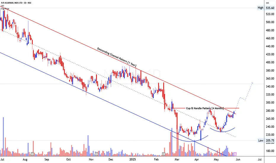 Now, the price is sitting right at the neckline of the Cup (~₹280), which is also the resistance of the descending channel. This is a high-probability breakout zone.