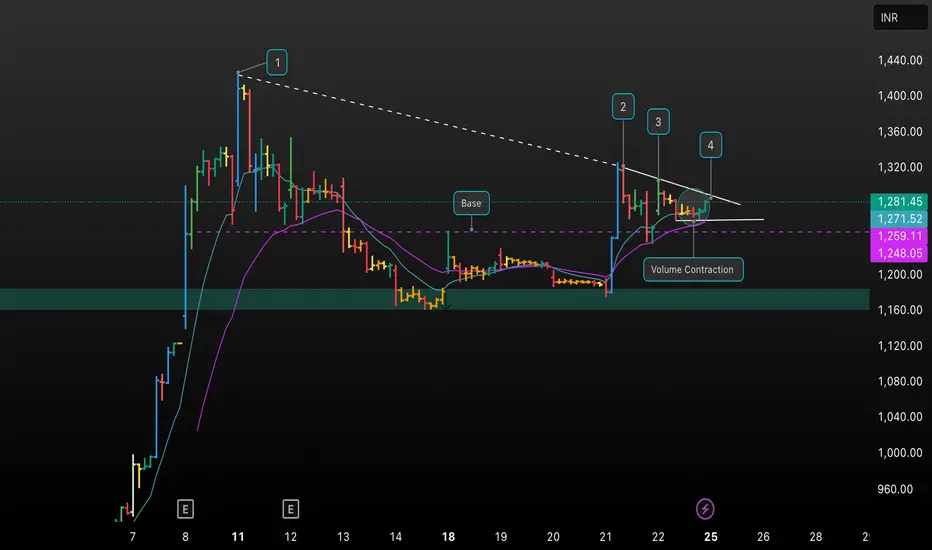 This chart showcases a detailed technical analysis of NSDL on the 45m timeframe, highlighting key price action zones, trendlines, and volume contraction patterns. I’ve marked the base formation, breakout attempts, and areas of interest using numbered points and indicator overlays. Notice the distinct volume contraction phase as price consolidates near resistance, potentially setting up a breakout. Key support/resistance levels and moving averages are also plotted.