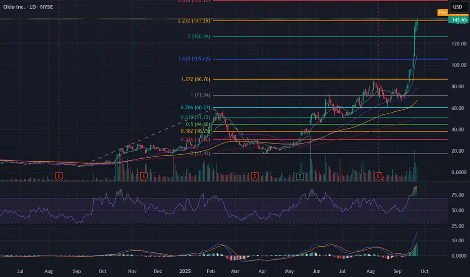 Oklo has reached a key Fib level, where it might start reversing on slowing momentum. Entered a short at $142.