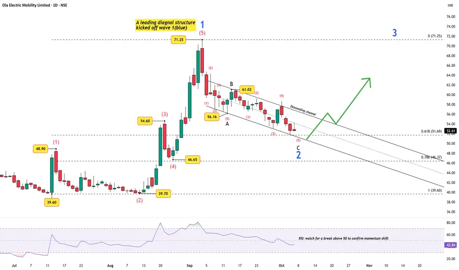 Technically, the stock appears to be cooling off after its first strong impulse. The chart reveals a leading diagonal structure kicking off Wave 1, followed by a Wave 2 correction unfolding as a 5-3-5 zigzag inside a descending channel. Price now hovers near the 0.618 to 0.786 Fibonacci retracement zone (₹51–₹46) — historically a prime setup area before a potential Wave 3 expansion.
