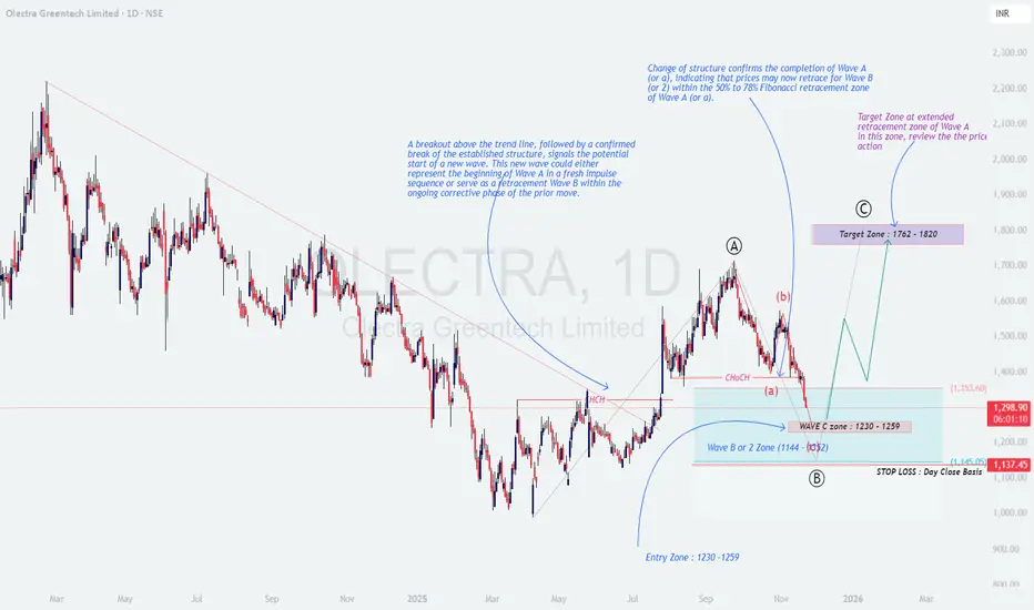 The chart of Olectra Greentech Ltd (1D) shows a well-defined Elliott Wave corrective structure, where price has now entered the expected Wave C completion zone (₹1230–₹1259).