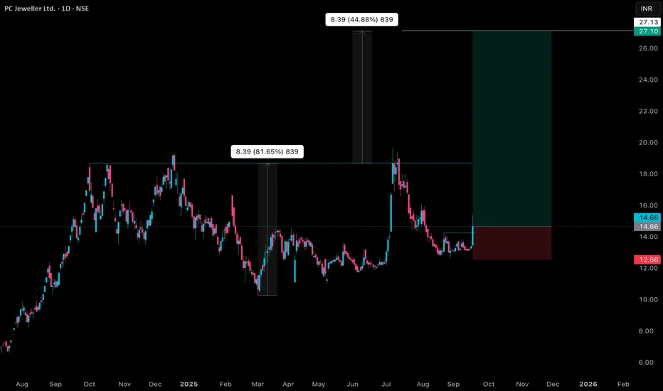 Technically, PC Jeweller is showing signs of a bullish shift with support around ₹13–14 and resistance near ₹15–16.70. A sustained move above ₹15 could open the path toward higher levels between ₹16 and ₹17. The stock has been forming higher lows and maintaining good volume, signaling strength. However, a breakdown below ₹13–13.50 would indicate a loss of momentum and potential short-term correction.