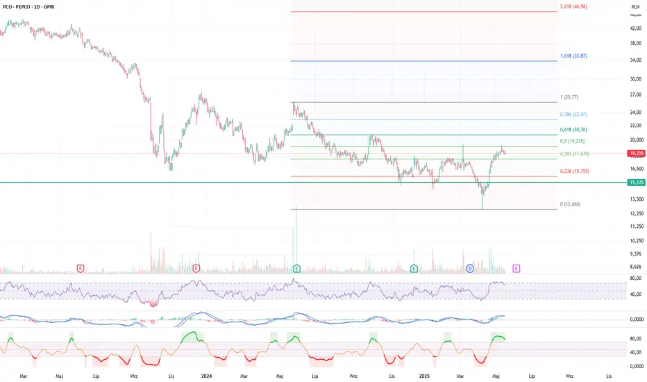 📌 Obecna cena znajduje się między poziomami 38,2% i 50% Fibo, testując 17,67–19,21 zł jako strefę oporu