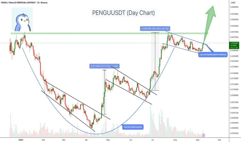 PENGU is showing a powerful technical setup with a Cup & Handle pattern forming on the daily chart – a classic bullish continuation pattern. Combined with its history of explosive moves after descending channel breakouts, this setup suggests strong upside potential.