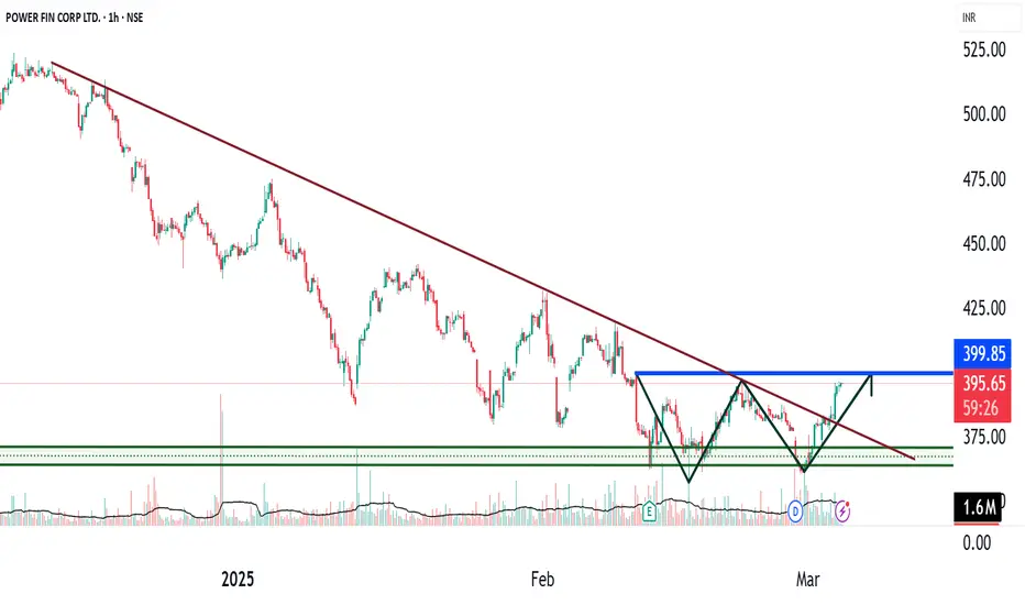PFC is currently in the process of forming a Double Bottom chart pattern at a strong support zone, indicating a potential reversal from a downtrend to an uptrend. The price is testing the support area, and the second bottom confirms strong demand in this region. A key signal for a bullish outlook is the breakout of the minor downtrend line, which suggests a shift in market sentiment from bearish to bullish.