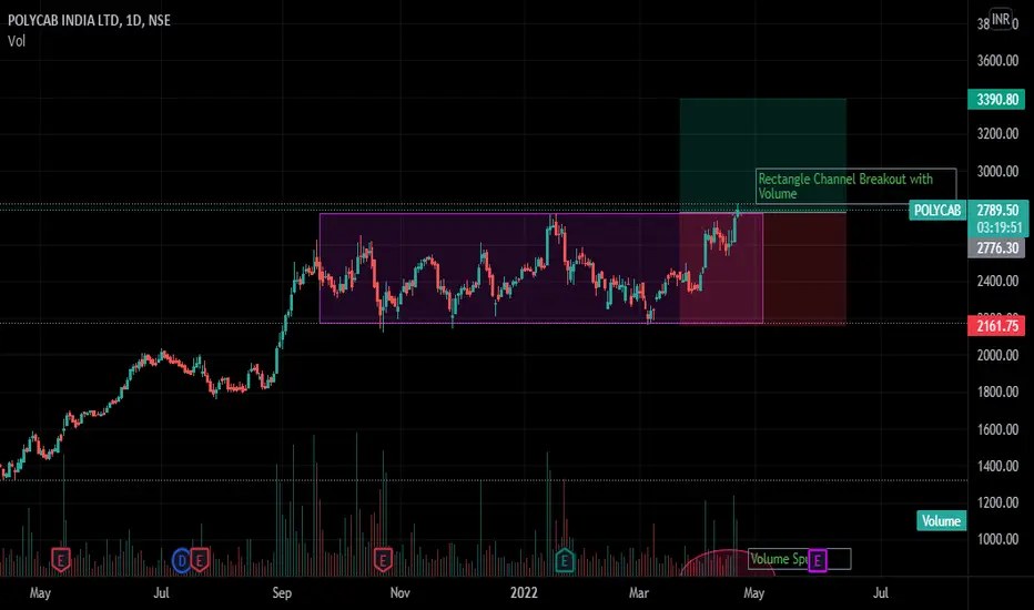 Rectangular Channel breakout in PolyCab. Positional Target of Rs. 3390 with Risk & Reward ratio of 1:1.
