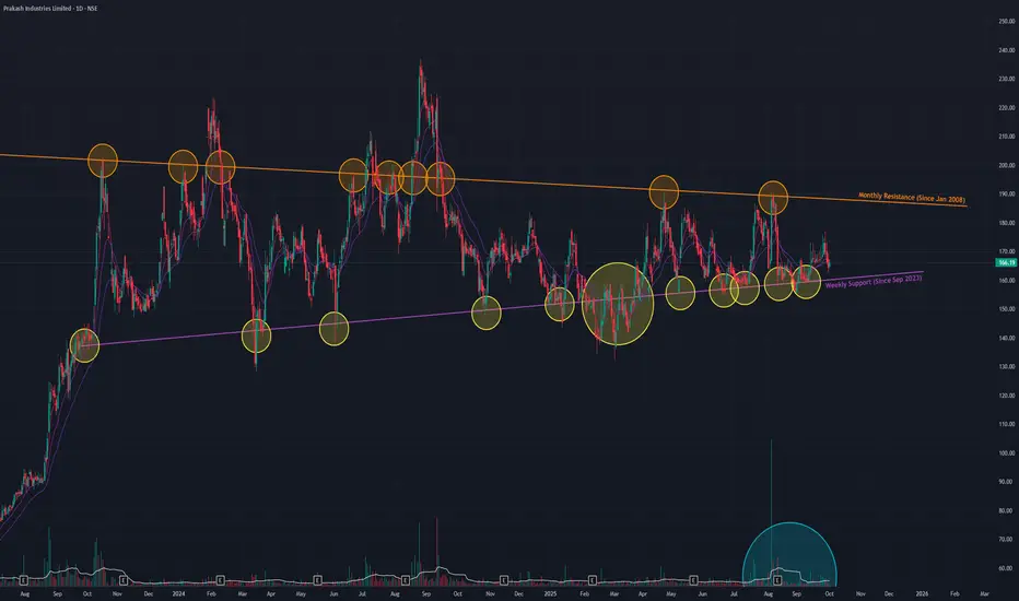 Prakash Industries is currently in a prolonged consolidation phase, trading within a large Triangle pattern that has been forming since September 2023. This pattern typically acts as a continuation of the prior trend, which in this case was a strong uptrend that began in April 2023.