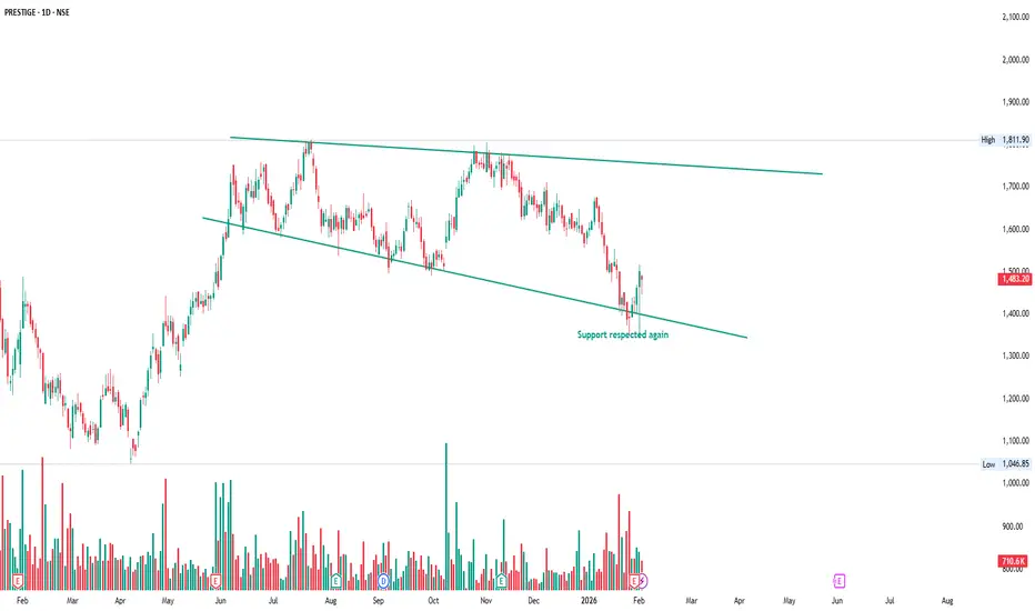 Prestige Group is currently moving inside a clear falling channel, where price is making lower highs and lower lows in a controlled manner.