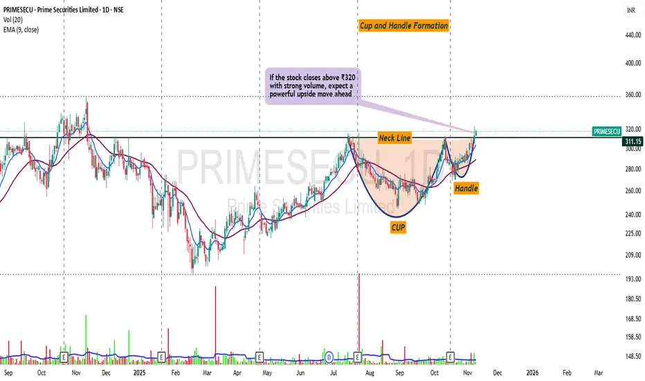 The stock is showing a classic Cup and Handle breakout setup. A decisive close above ₹320, supported by volume, can lead to a strong upside rally in the coming sessions. Traders should watch for volume confirmation before entering.