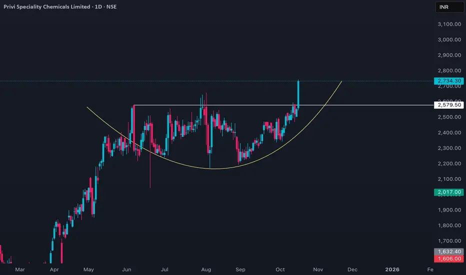 PRIVISCL (Privi Speciality Chemicals Ltd) is currently trading with a price near ₹2,520–₹2,730, showing recent volatility with a slight downward bias. The stock touched a 52-week high at ₹2,660 in August 2025 and experienced a notable pullback from that level. On October 15, it closed at ₹2,539, after reaching a low of ₹2,505 during the session. Average daily volumes are moderate, and the deliverable percentage remains healthy, typically above 75%.