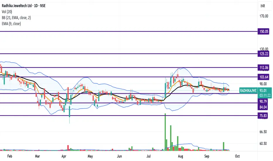 Radhika Jeweltech is trading below important crossover level 9 EMA(Orange Line) just below the 21 EMA (Black Line).