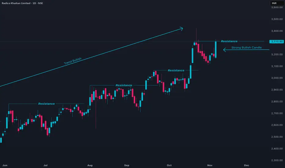 RADICO (Radico Khaitan Ltd) has recently shown a moderate recovery after a corrective phase, supported by buying interest near major moving average support zones. Price action indicates consolidation with a slight bullish bias, as the stock is forming higher lows and attempting to break key resistance levels. RSI momentum is gradually improving from oversold territory, while MACD and Stochastics reflect early signs of upside momentum, though not yet confirmed by strong volume.