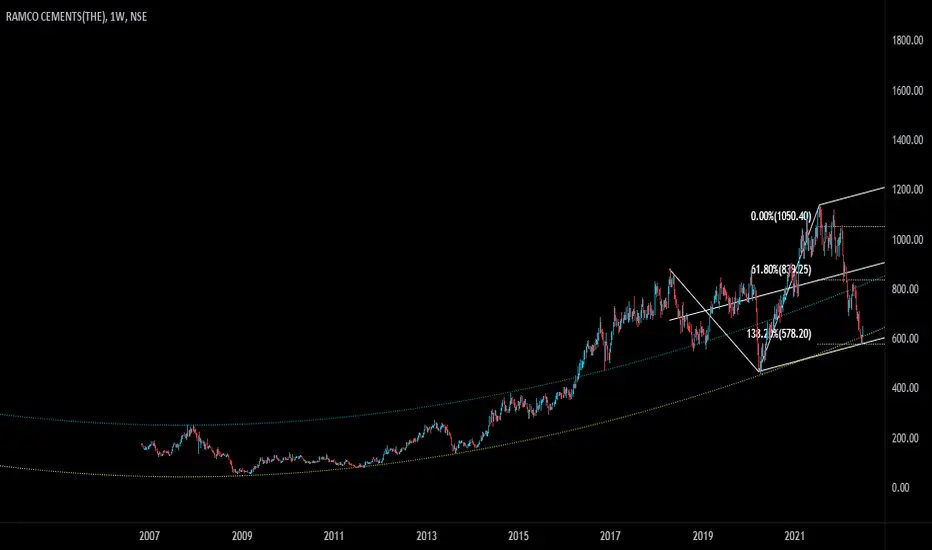 Stock has pronited two green candles in the weekly chart right at the confluence of lower median of white pitchfork, 138.2% and yellow curved trend line......stock can be bought for a target of 839, which is the meeting point of blue curved trend line and 61.8%...