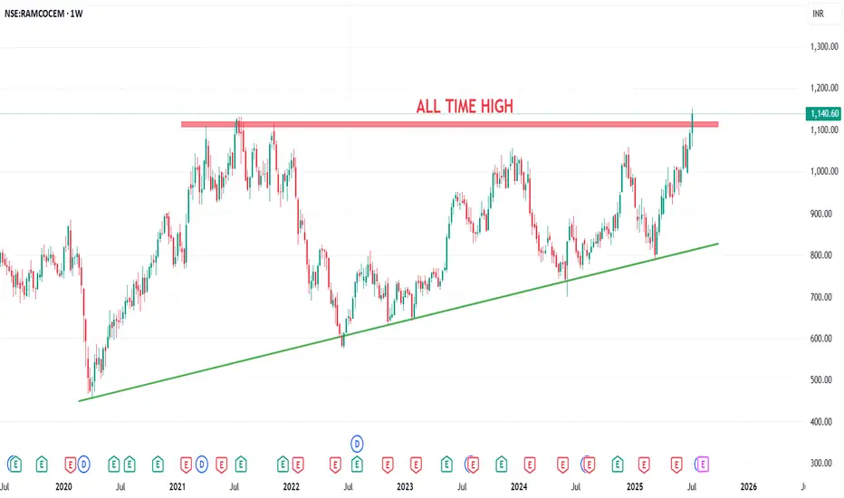 Ramco Cement Limited has formed a beautiful ascending triangle pattern with a strong resistance zone at ₹1080–₹1130, tested since 2021. Today, it broke out and hit a new all-time high of ₹1152, now hovering around ₹1140.