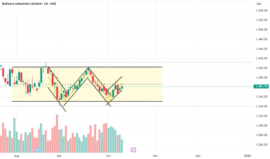 Priority should be given to waiting for either the 'W' neckline (₹1,400) to break for the short-term target, or for the main range boundaries (₹1,430 or ₹1,350) to break for the larger trend trade. Wait for volume confirmation on all major breakouts.