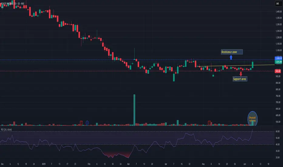 ROUTE is giving hint of reversal with unusual volume. And in mu opinion reversal will be confirmed only if it closes above 1030. If it confirmed then 15-17% from here may be possible. And if it closes below 930 may change my view. Today it is attempting to close above short term key moving averages. Keep a closer watch