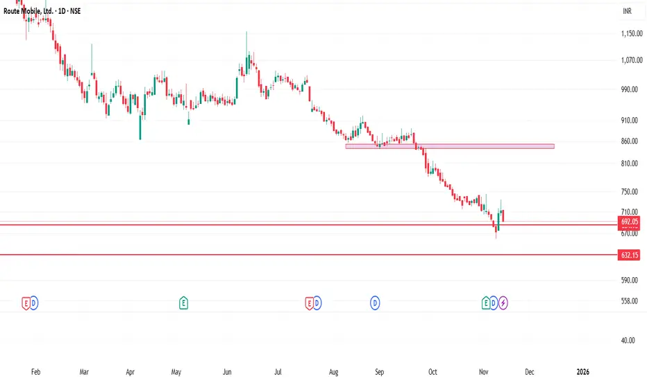 After continuous fall route mobile is reached its support levels, Stock might bounce between levels 630 - 690 levels, on daily TF, wait for 710 levels to cross.