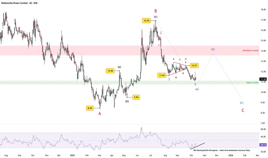 After an extended five-wave decline from the ₹16.92 peak, RattanIndia Power appears to have completed a smaller-degree Wave (a) near the support cluster around ₹11. The substructure shows a clean 1-2-3-4-5 sequence, with Wave 4 forming a contracting triangle and Wave 5 bottoming right into the green support zone.
