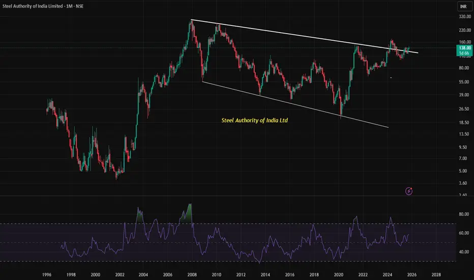 Steel Authority of India Ltd. (SAIL), one of India’s largest steel producers, is currently trading around ₹138.80 and showing signs of a major technical breakout. What makes this move noteworthy is that it’s emerging from a downward-sloping channel that has persisted since 2007–2008, spanning nearly 17 years. A breakout from such a long-term pattern is rare and often carries significant implications for future price action.