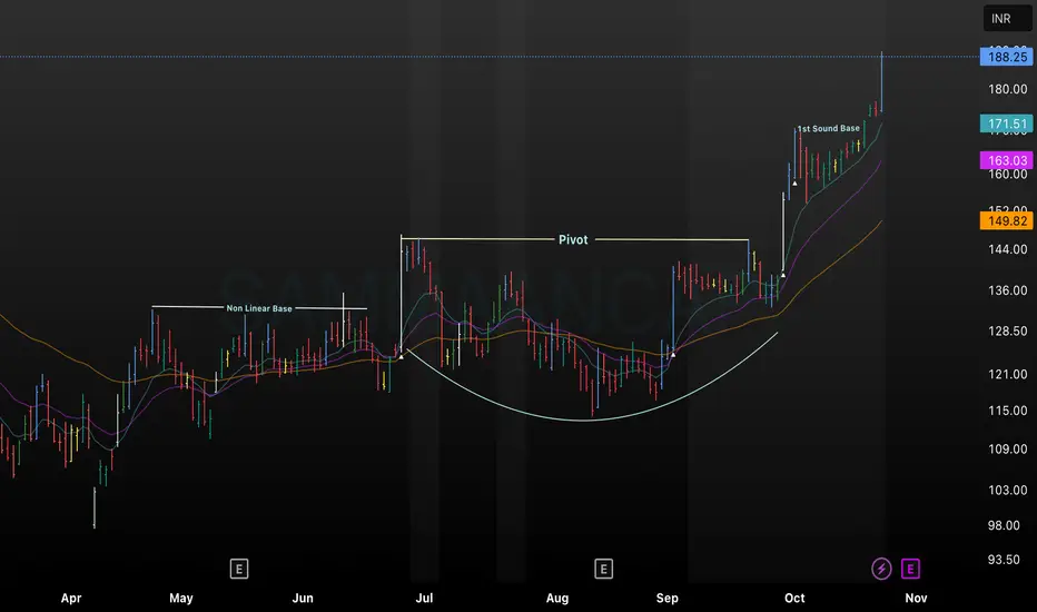 This TradingView chart displays a textbook Cup and Handle breakout pattern in Sammaan Capital (SAMMAANCAP). The setup begins with a “Non Linear Base,” transitions into an extended consolidation, and establishes a clear pivot zone before the breakout. A rapid surge follows, confirmed by the formation of the “1st Sound Base,” and supported by rising moving averages. This annotated chart is ideal for traders examining advanced base patterns and breakout behavior in Indian NBFC stocks, offering valuable reference for strategy building and technical analysis education