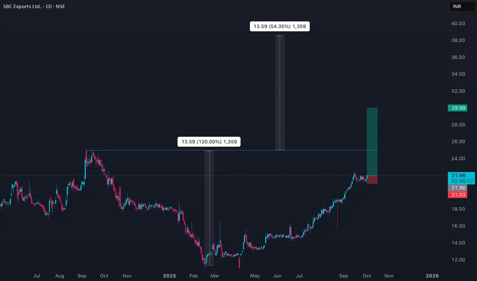 SBC Exports traded at 21.54 today, showing limited volatility and maintaining a generally sideways movement. The price opened near 21.40 and moved within a narrow range between 21.16 and 21.61, with no aggressive buying or selling pressure evident for most of the session. Trading volumes remained moderate, and the close slightly favored the bulls as the stock ended near the day’s high.