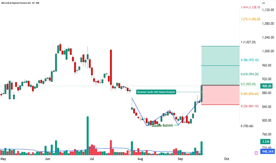 Learning Note: SBICARD is showing momentum revival with strong volumes; watch for sustainability above ₹900 to confirm trend continuation.