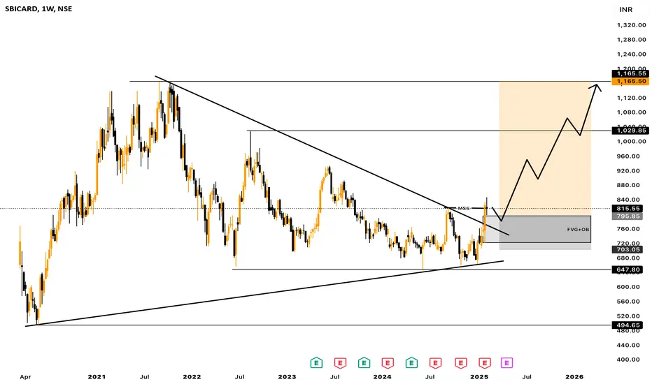 • Resistance Breakout: The upper trendline, which acted as resistance, has been breached, and the stock is now retesting the breakout level (~800).