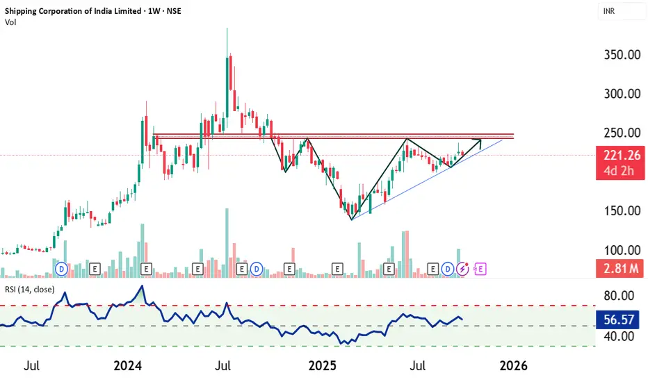 📈 Chart Analysis: On the weekly chart, Shipping Corporation of India (SCI) is showing signs of forming a "Bullish inverted head and shoulders pattern", which is typically a reversal structure that signals the resumption of an uptrend. The neckline resistance is placed near ₹245–₹250 levels, and a decisive breakout above this zone could unlock strong upside momentum.