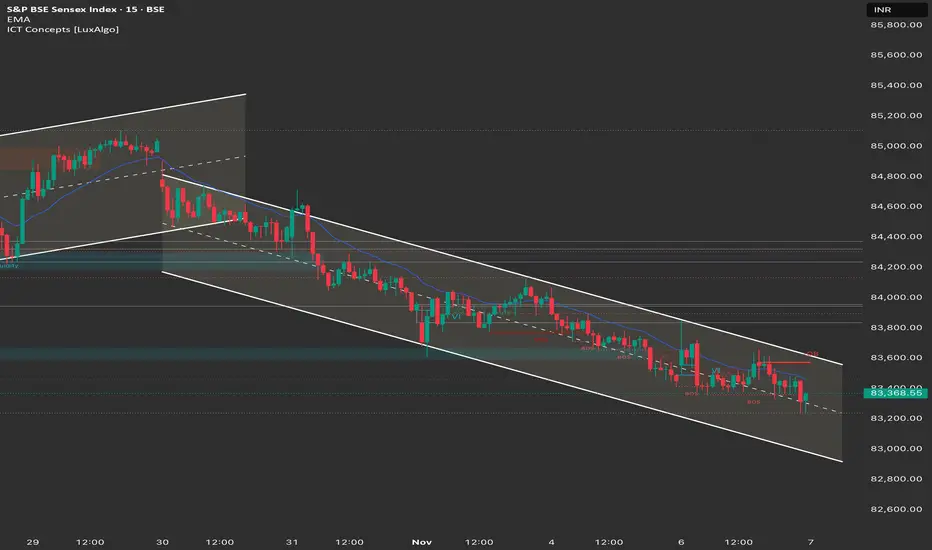 Market Outlook: The Sensex is in a strong bearish trend, with the structure favoring continuation towards major support at 83,200. The overall strategy is Sell on Rise or Breakdown.