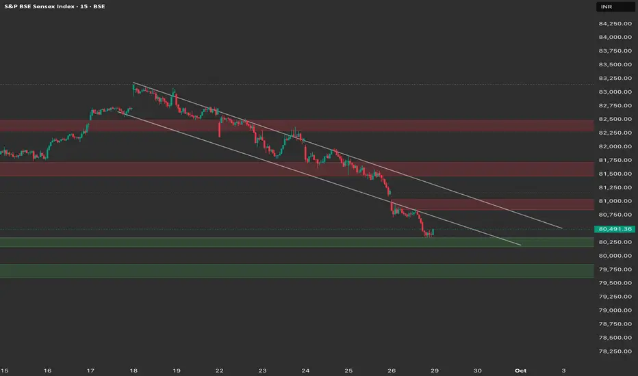 Structure: The Sensex is in an accelerated corrective phase. It has broken through the 81,800-82,000 support and, more recently, the 81,000 psychological level. The price is now trading at the bottom of a steep descending channel and has entered the major demand zone of 80,400 - 80,600.