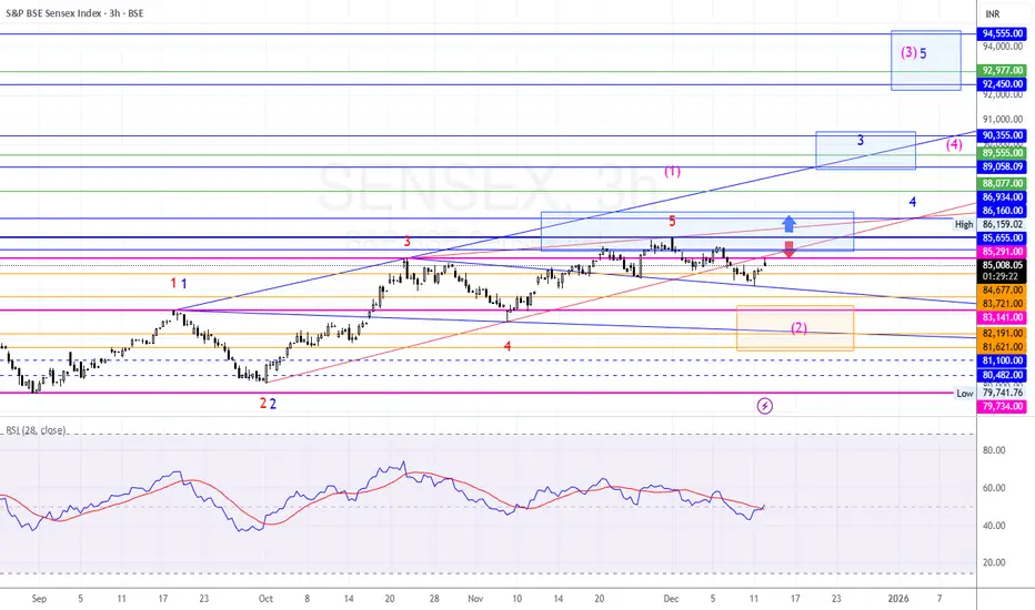 Sensex continues to respect the medium-term bullish channel. The recent pullback into the support band around 84,300 – 83,700 has likely completed wave 4, and the index is now attempting a fresh upside rotation.