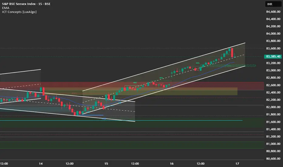 Structure: The Sensex is in a high-conviction bullish trend. The price has decisively broken out above the major supply zone of 82,300 - 82,500 and is now trading aggressively towards its next major target. The structure is a clear ascending channel, with strong bullish momentum evident across the chart.