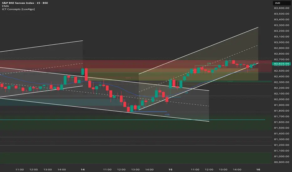 Structure: The Sensex has confirmed a strong bullish trend resumption, breaking out of the corrective descending channel that formed last week. The price is now trading within a clear ascending channel and has closed right below the immediate overhead supply.