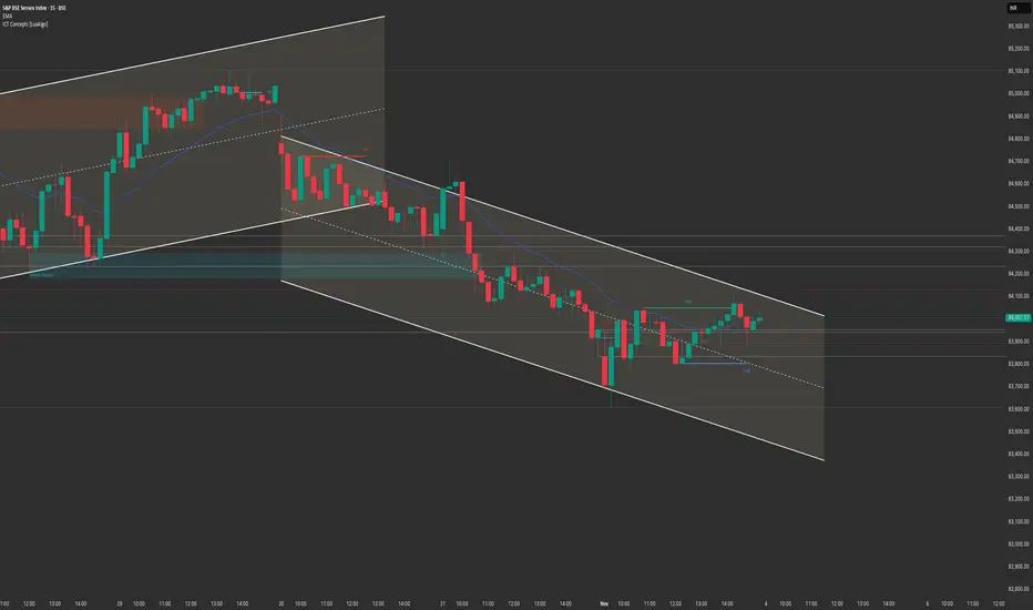 Structure: The Sensex is now in a Corrective Phase within its broader uptrend. The price was aggressively rejected from the 85,300 - 85,600 supply zone (recent high). The price has broken below the lower trendline of the immediate ascending channel, confirming a Market Structure Shift (MSS) to the downside. The strong bearish candle closed near the lower boundary of the broader corrective channel.