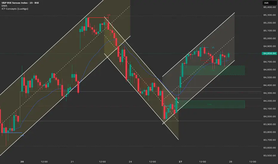 Structure: The Sensex has re-established its Strong Bullish Momentum. The large bullish candle on Monday has effectively cancelled the aggressive selling seen on Friday, confirming a successful retest and bounce from the lower boundary of the steep ascending channel. The price has reclaimed the critical 84,200 - 84,400 zone.