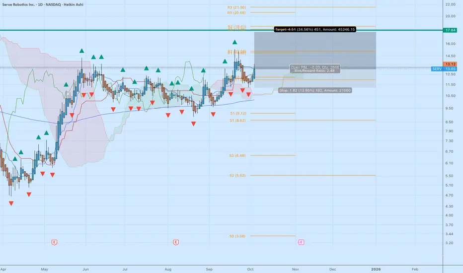 SERV is positioned in a textbook Ichimoku breakout zone. Technical signals—cloud breakout, bullish Tenkan/Kijun cross, and confirmed Chikou alignment—are supported by strong fundamental momentum in the autonomous robotics sector.