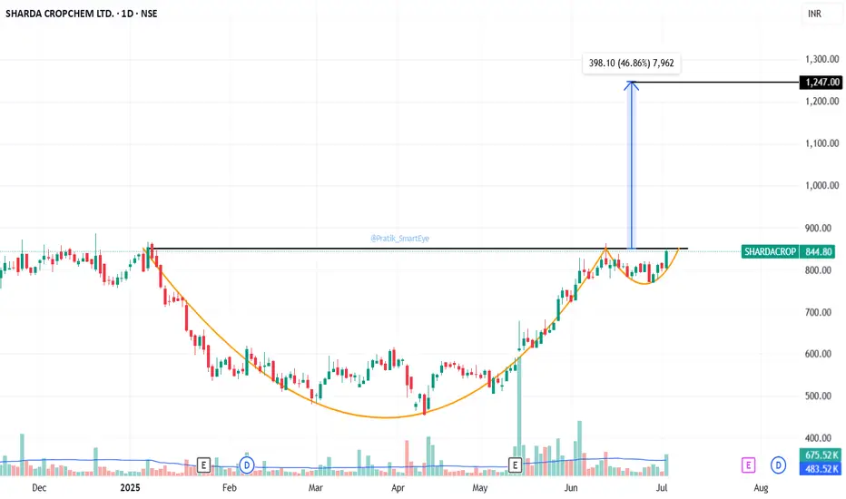 Sharda Cropchem: Breakout with Cup & Handle Pattern at 850. CMP 844.