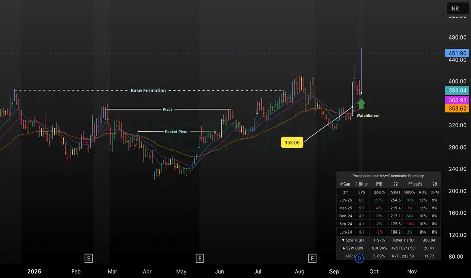 Price forms a solid base and builds momentum via pocket pivot. After reclaiming key averages, a clean breakout occurs above the pivot level. This setup shows base formation, pivot, pocket pivot, entry mark, and aggressive upside, ideal for swing traders tracking volume and price action. Fundamental snapshot included for context.