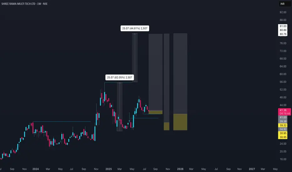 Shree Rama Multi-Tech Ltd is currently trading around ₹41 as of late July to early August 2025. In the recent period, the stock has moved within a narrow range of ₹40.50–₹42.95, reflecting relatively low volatility. The short-term price trend appears positive, with upside targets ranging from ₹41.60 to ₹47.58 for the near-to-mid term. On the downside, support levels are seen near ₹40.06 and, more distantly, at ₹31.79 and below.