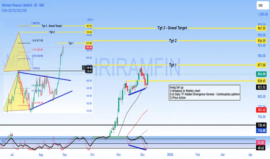 The chart shows a swing trading setup with upside potential toward 877 - 967 if support at 838 holds. A break below 825 would invalidate the bullish structure.