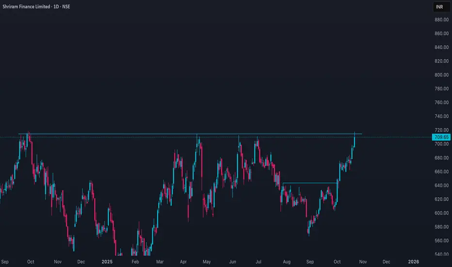 As of October 23, 2025, **Shriram Finance Ltd (NSE: SHRIRAMFIN)** closed approximately at **₹695.25**, showing sideways price action near its recent high. The stock traded within the range of ₹675 to ₹717.75 during the day, with a market capitalization of about **₹1.33 lakh crore**.