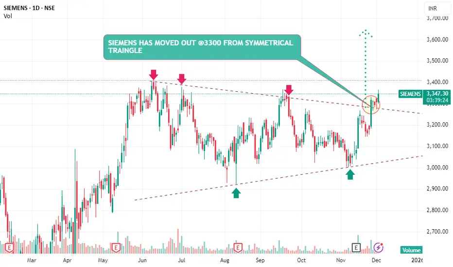 Trend Context: Siemens has been in a broader uptrend, and triangle breakouts in an uptrend typically act as continuation patterns.