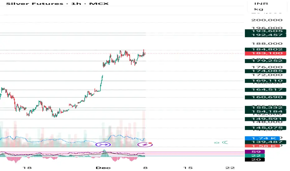 Asset Name Silver MCX Futures (Mar 2026): ₹1,83,100/kg [ 🟩 +4,962 (+2.79%) ] (LTP: Dec 5, 2025 Close)