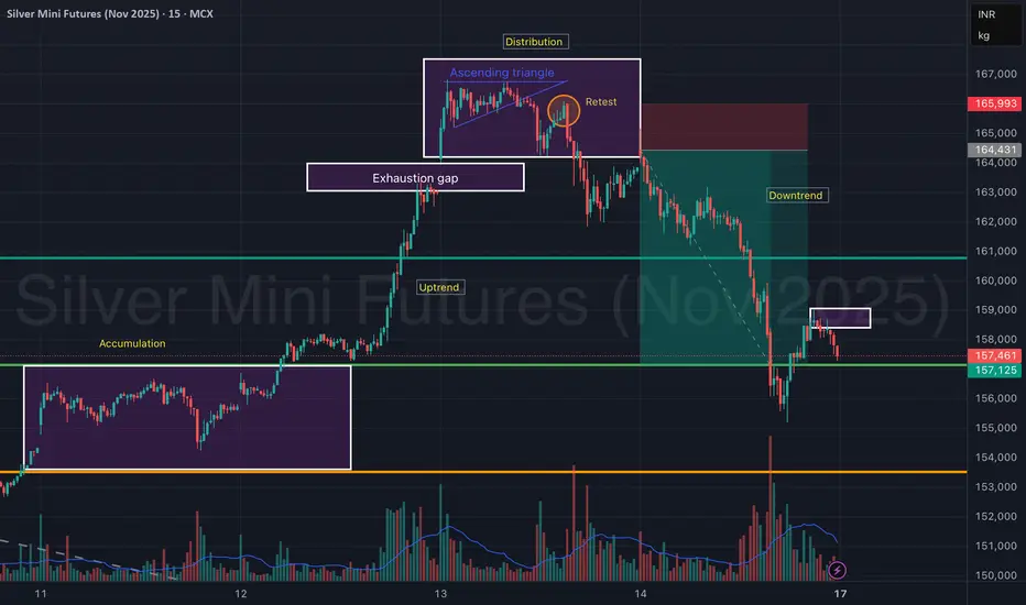 The move began with accumulation around ₹1,55,000, followed by a strong uptrend breakout, leading to a sharp rally. However, as price entered the ascending triangle near the ₹1,66,000 zone, momentum weakened, signaling distribution.