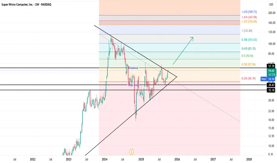 SMCI is at a major decision point. Wait for breakout confirmation above $57.78, use the triangle structure and Fibonacci extensions as your target zones, and manage risk via the marked stop levels. This technical setup combines classical charting with quantitative projections, providing a clear framework for swing traders and investors.