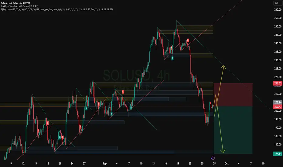 Bullish scenario: SOL holds support near $200–$210 and breaks through the $245–$250 zone, leading to a directional move toward $270 and beyond (even to $300).