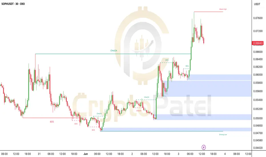 After a long downtrend, SOPH broke structure and shifted to bullish with strong price action from the $0.058–$0.060 demand zone.