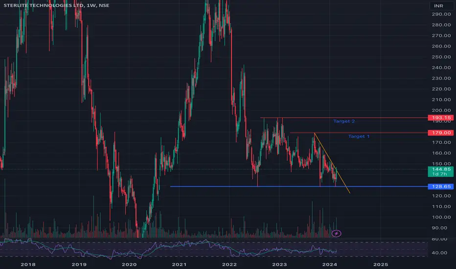 Taking support at 128 on monthly chart. Breaking trendline at 144 on Daily and Weekly chart. Allow weekly candle to complete. Wait for retest and buy at breakout.