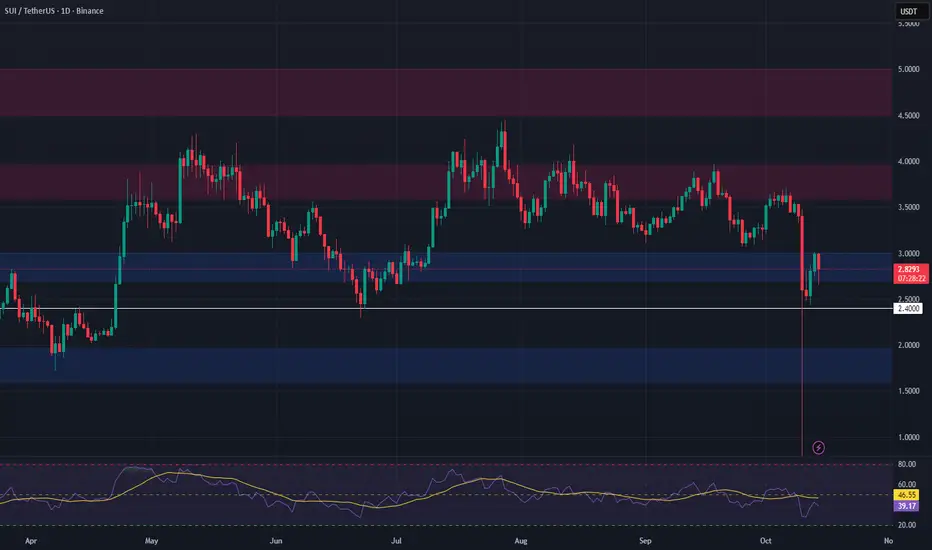 SUI is currently trading in a major support zone between $2.70 and $3.00, a level that has previously acted as a strong demand area. The price is consolidating here, and this could offer a high-probability long opportunity for swing traders watching for a potential bounce.